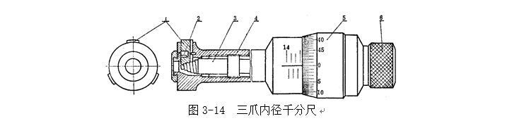 三爪內(nèi)徑千分尺的工作原理,圖3-14為測量范圍11~14mm的三爪內(nèi)徑千分尺,當(dāng)順時(shí)針旋轉(zhuǎn)測力裝置6時(shí),就帶動(dòng)測微螺桿3旋轉(zhuǎn),并使它沿著螺紋軸套4的螺旋線方向移動(dòng),于是測微螺桿端部的方形圓錐螺紋就推動(dòng)三個(gè)測量爪1作徑向移動(dòng)。扭簧2的彈力使測量爪緊緊地貼合在方形圓錐螺紋上,并隨著測微螺桿的進(jìn)退而伸縮。