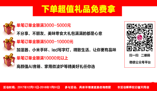 2017年12月11日—2018年1月31日“預(yù)存貨款送豪華大禮,活動期間下單更有超值禮品免費(fèi)拿”雙雙有豪禮!
