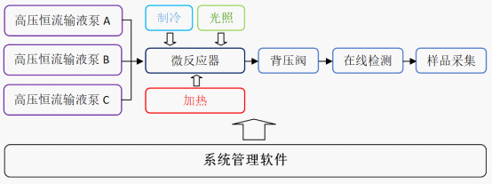 如圖所示,物料通過高壓輸液泵輸送到微反應器中,在高壓密閉的微通道管路中,通過溫度控制,,使合成反應能夠快速完成并極大提高收率,背壓閥能夠人為控制反應器內壓力,物料在出口處通過在線檢測器檢測合成結果,經過檢測后的產品可通過樣品采集器按預設的收集條件收集到不同的容器中。整個反應系統(tǒng)可通過管理軟件實現(xiàn)自動控制,具有方法建立、模塊搭建、模塊參數(shù)設置,全反應過程參數(shù)實時監(jiān)控,數(shù)據追溯,用戶管理及智能專家數(shù)據庫等功能,專用管理軟件可將整個反應體系效率發(fā)揮到極致。