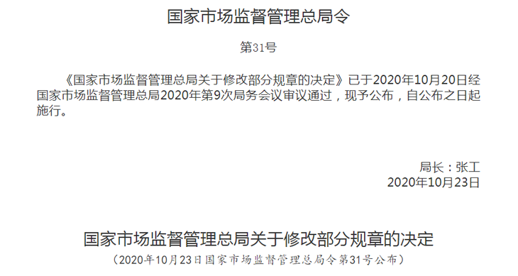 為了全面落實(shí)黨的十九屆三中全會(huì)審議通過的《中共中央關(guān)于深化黨和國(guó)家機(jī)構(gòu)改革的決定》《深化黨和國(guó)家機(jī)構(gòu)改革方案》和十三屆全國(guó)人大一次會(huì)議批準(zhǔn)的《國(guó)務(wù)院機(jī)構(gòu)改革方案》,確保行政機(jī)關(guān)依法履行職責(zé),進(jìn)一步推進(jìn)簡(jiǎn)政放權(quán)、放管結(jié)合、優(yōu)化服務(wù)改革,市場(chǎng)監(jiān)管總局決定對(duì)30件部門規(guī)章的部分條款予以修改。