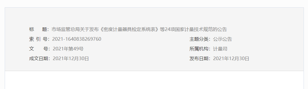 根據《中華人民共和國計量法》有關規定,現批準《密度計量器具檢定系統表》等24項國家計量技術規范發布實施。