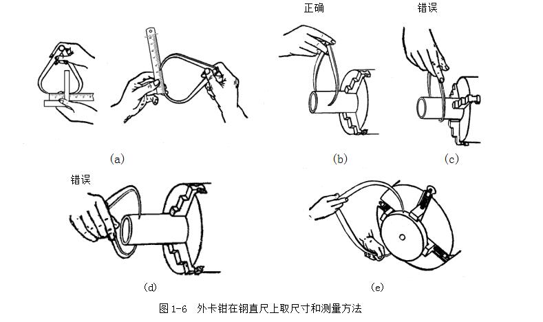 用巳在鋼直尺上取好尺寸的外卡鉗去測量外徑時,要使兩個測量面的聯線垂直零件的軸線,靠外卡鉗的自重滑過零件外圓時,我們手中的感覺應該是外卡鉗與零件外圓正好是點接觸,此時外卡鉗兩個測量面之間的距離,就是被測零件的外徑。所以,用外卡鉗測量外徑,就是比較外卡鉗與零件外圓接觸的松緊程度,如圖1-6(b)以卡鉗的自重能剛好滑下為合適。如當卡鉗滑過外圓時,我們手中沒有接觸感覺,就說明外卡鉗比零件外徑尺寸大,如靠外卡鉗的自重不能滑過零件外圓,就說明外卡鉗比零件外徑尺寸小。切不可將卡鉗歪斜地放上工件測量,這樣有誤差。圖1-6(c) 所示。由于卡鉗有彈性,把外卡鉗用力壓過外圓是錯誤的,更不能把卡鉗橫著卡上去,圖1-6(d) 所示。對于大尺寸的外卡鉗,靠它自重滑過零件外圓的測量壓力已經太大了,此時應托住卡鉗進行測量,圖1-6(e)所示。